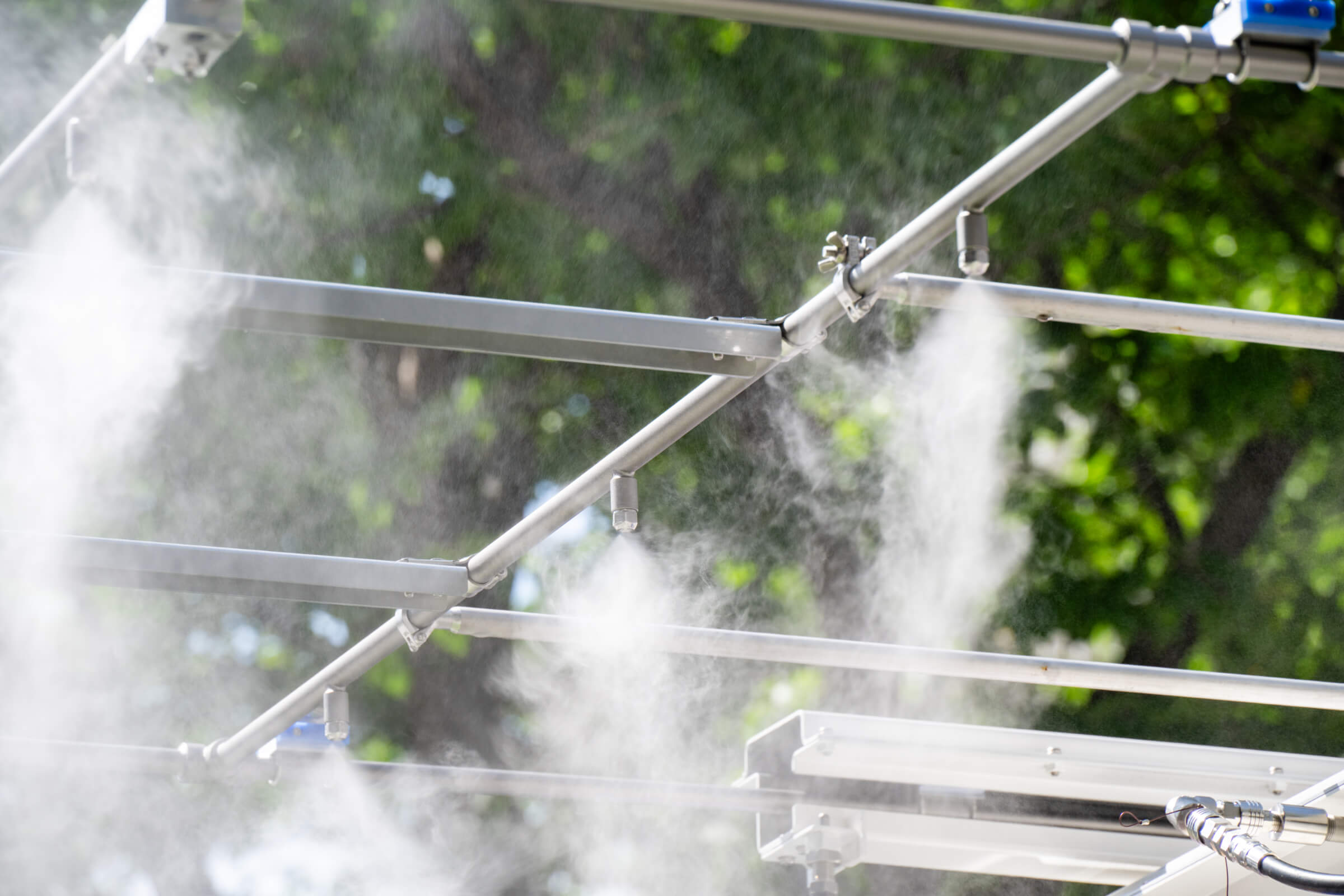 真夏の日差しのなかでも、涼しいと感じたい。 霧がつくる涼しさで公園に憩いの場を生み出します。