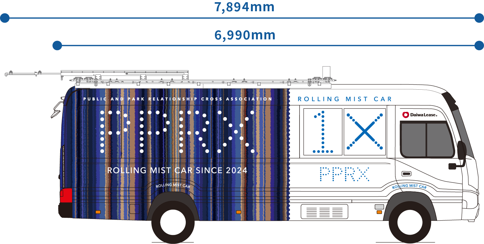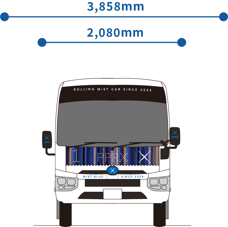 ミストのノズルが車両よりも長いエリアに広がるため、車両設置に上記の空間が必要となります。