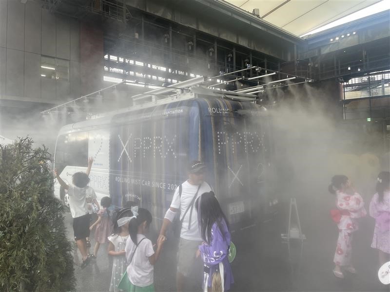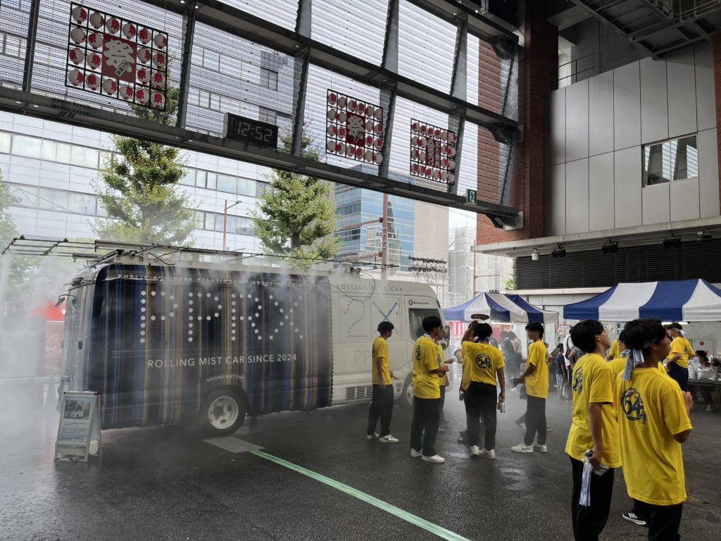 ミスト車は、人通りの多い久留米シティープラザ六角堂広場に設置され、お祭りの熱気に負けじとミストを噴き出していました。
